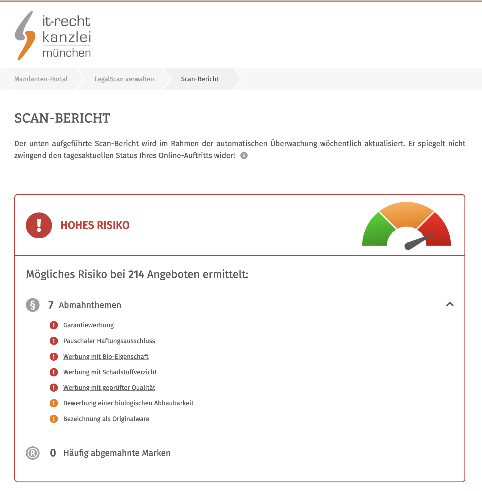 eingängiger Auflistung aller gefundenen Abmahnrisiken und individuellen Bedien- und