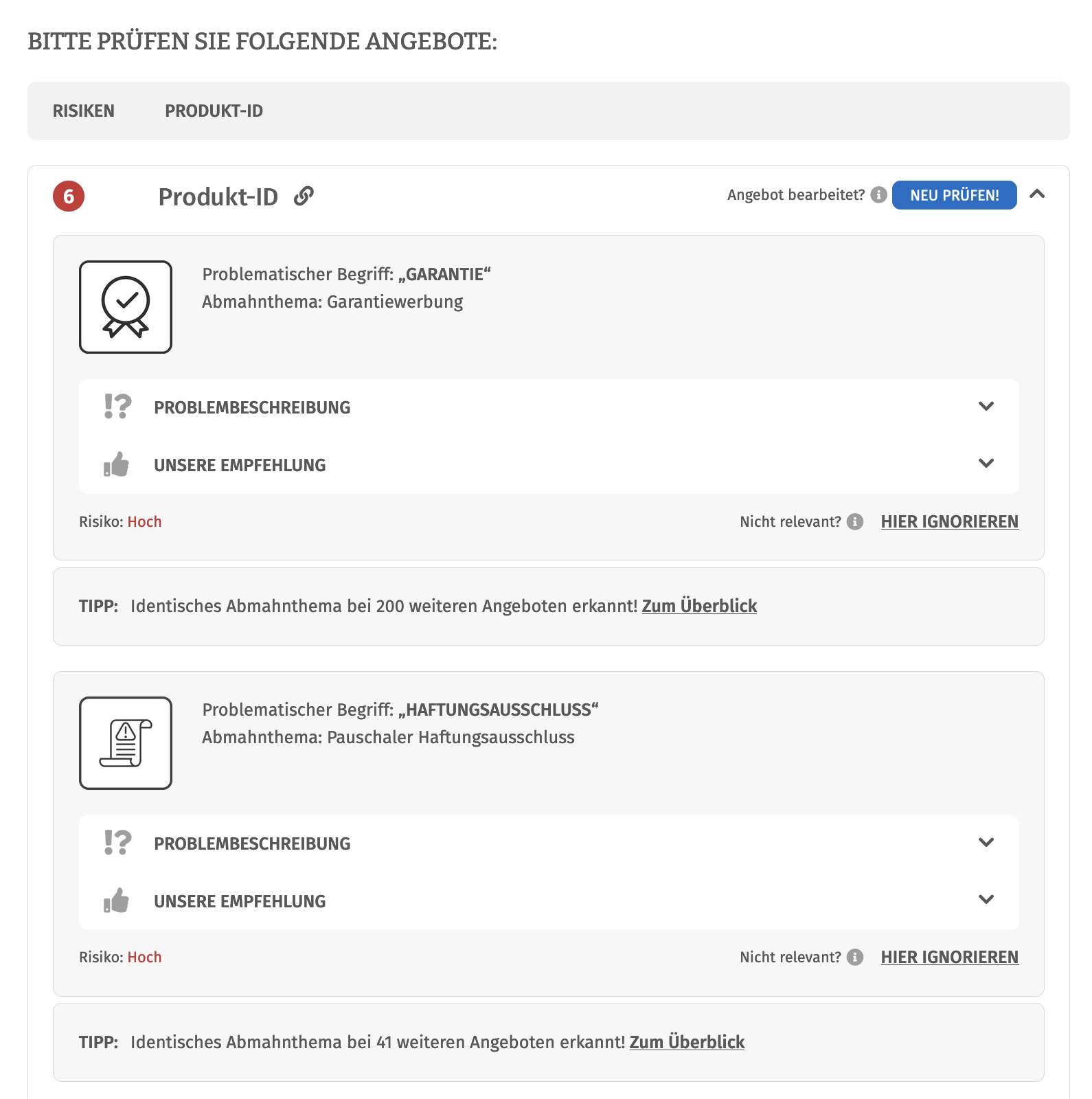 Abmahnrisiken gefunden werden. Detaillierte Beschreibungen und Lösungshilfen erklären